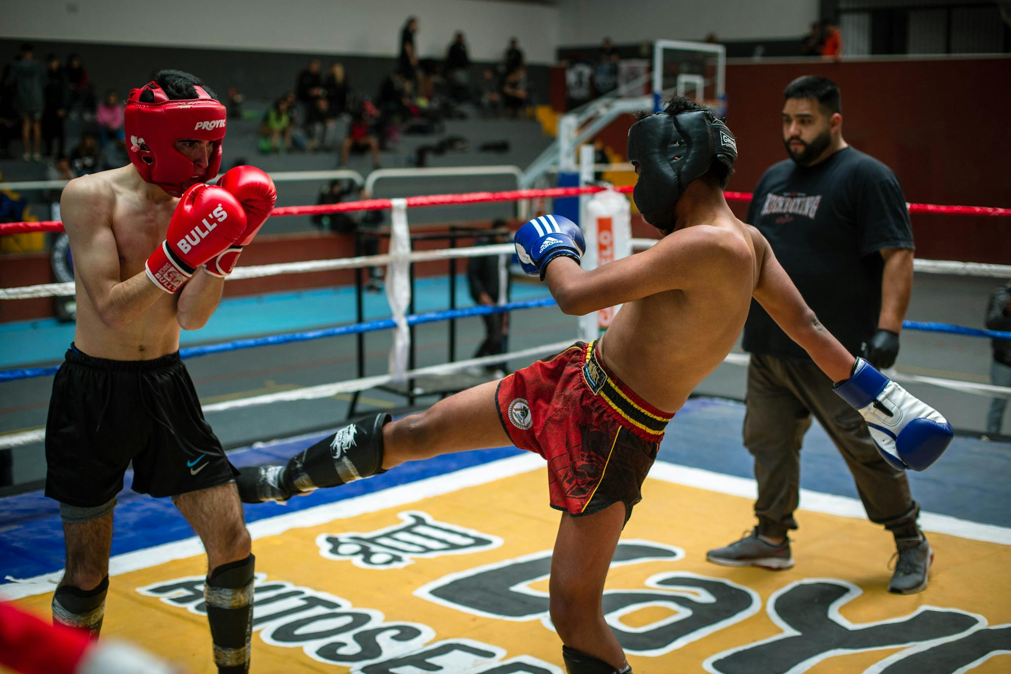 Exciting boxing match featuring a dynamic kick captured in action, showcasing determination and skill.